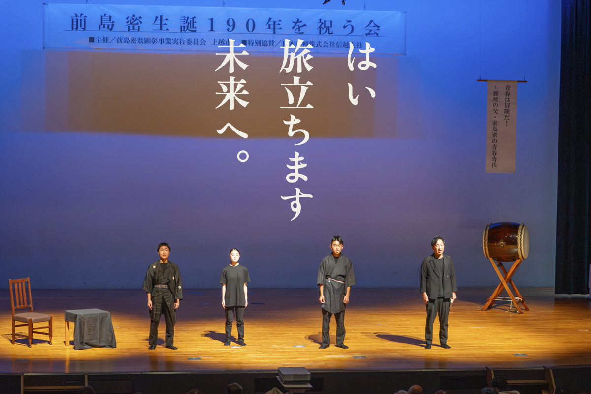 今回は、「あなたへつなげるバトン」というテーマのもと、若い世代とのつながりを軸に据えたイベントを企画しました。そして、生誕地のすぐ近くにある雄志中学校の生徒等とともに、創作劇というかたちで、前島密の志や歩みを次世代が語る舞台を公演しました。