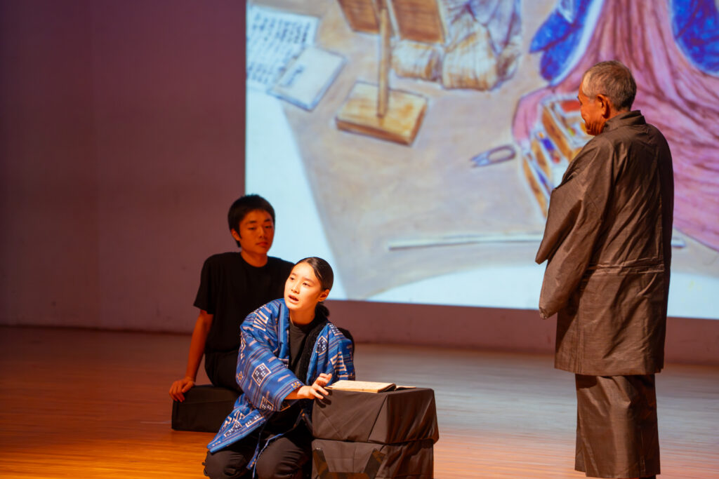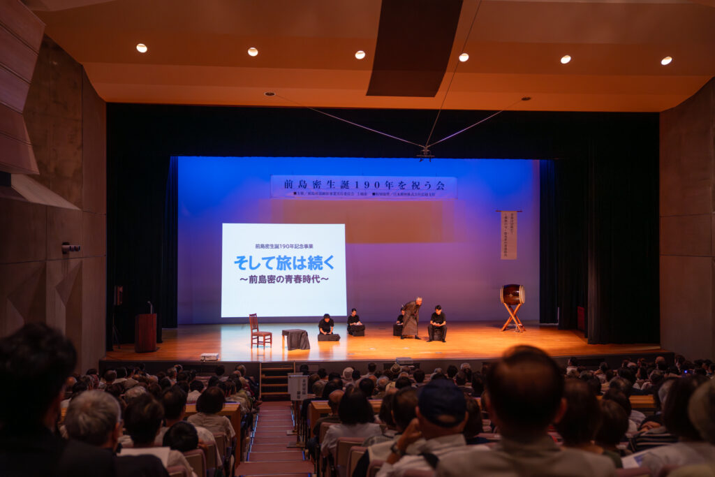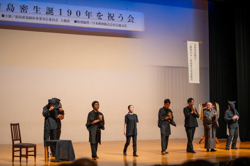 今回は、「あなたへつなげるバトン」というテーマのもと、若い世代とのつながりを軸に据えたイベントを企画しました。そして、生誕地のすぐ近くにある雄志中学校の生徒等とともに、創作劇というかたちで、前島密の志や歩みを次世代が語る舞台を公演しました。